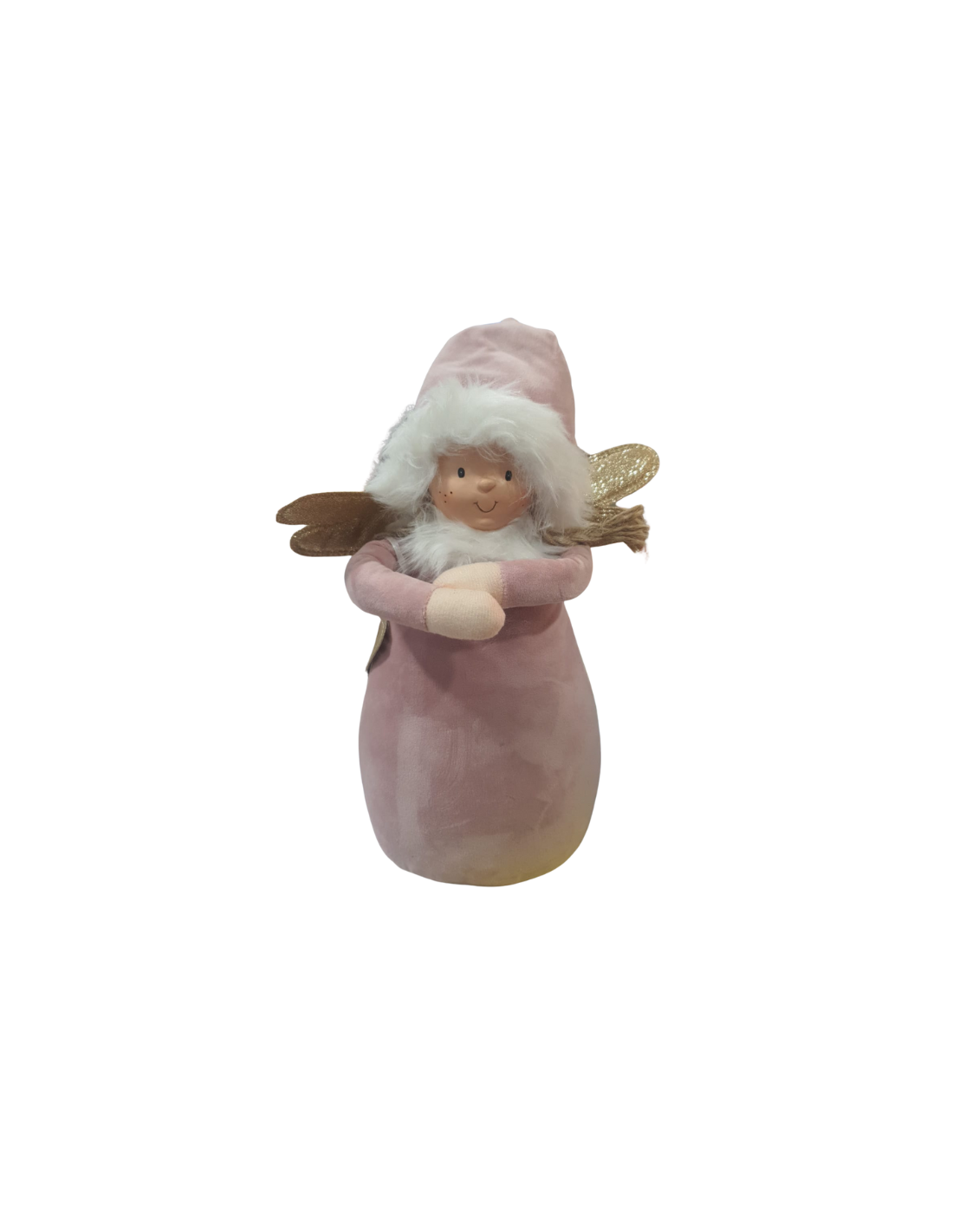 Alto 36 cm, questo angelo si distingue per il suo abito rosa dalle sfumature morbide, il cappello coordinato e le ali dorate. I dettagli soffici e le finiture curate donano un aspetto elegante e armonioso, ideale per creare un’atmosfera calda e natalizia.
