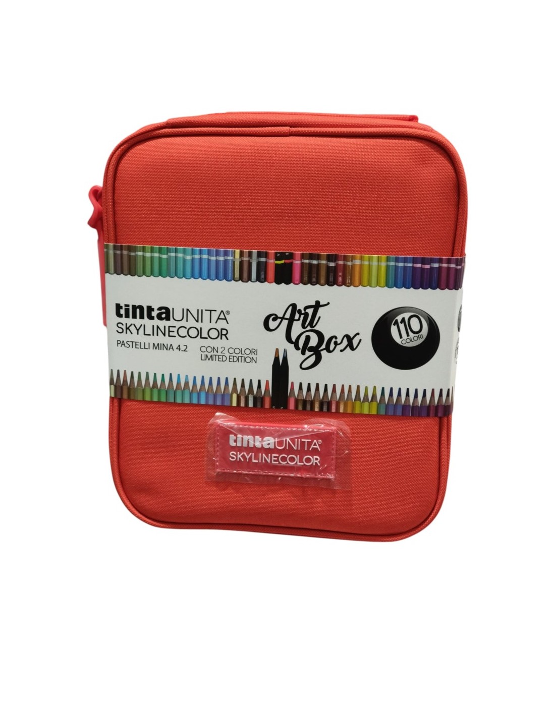 Tinta UnitaArt Box TintaUnita Skylinecolor con 110 colori assortiti. Astuccio con manico, interno organizzato, pastelli mina 4,2 mm antirottura e speciali multicolor. Edizione limitata.