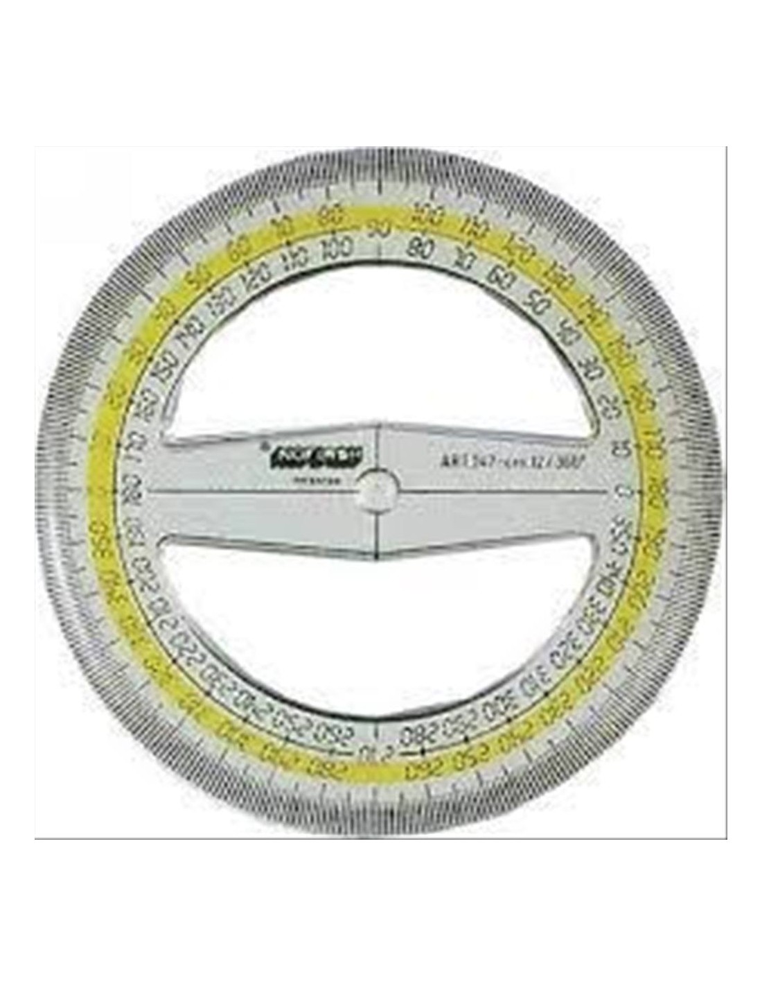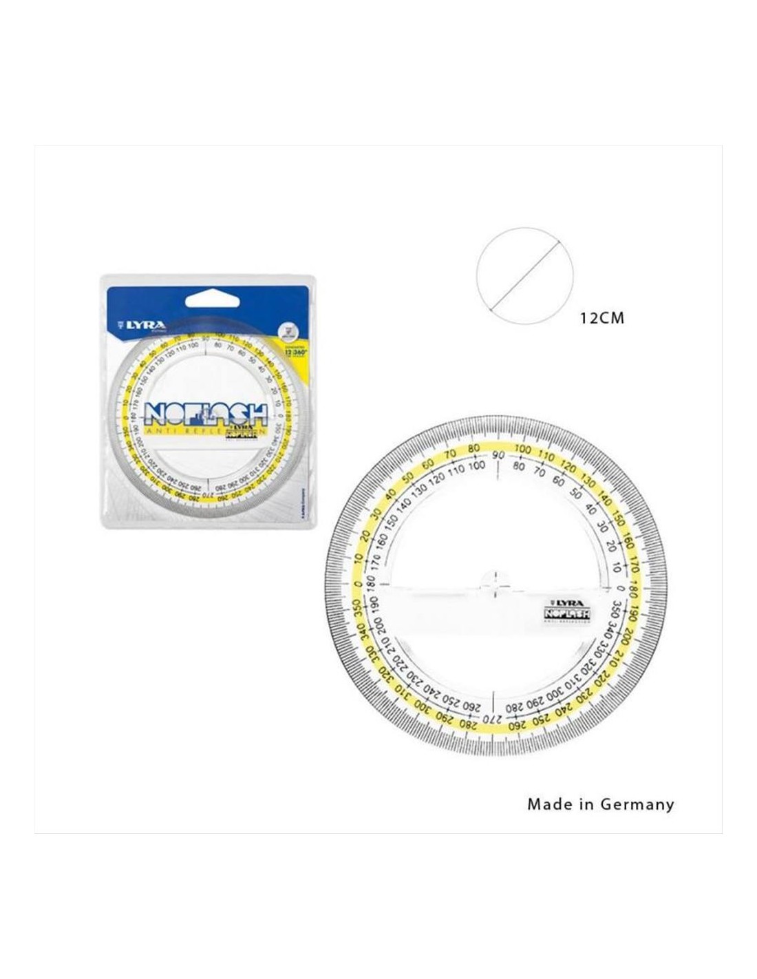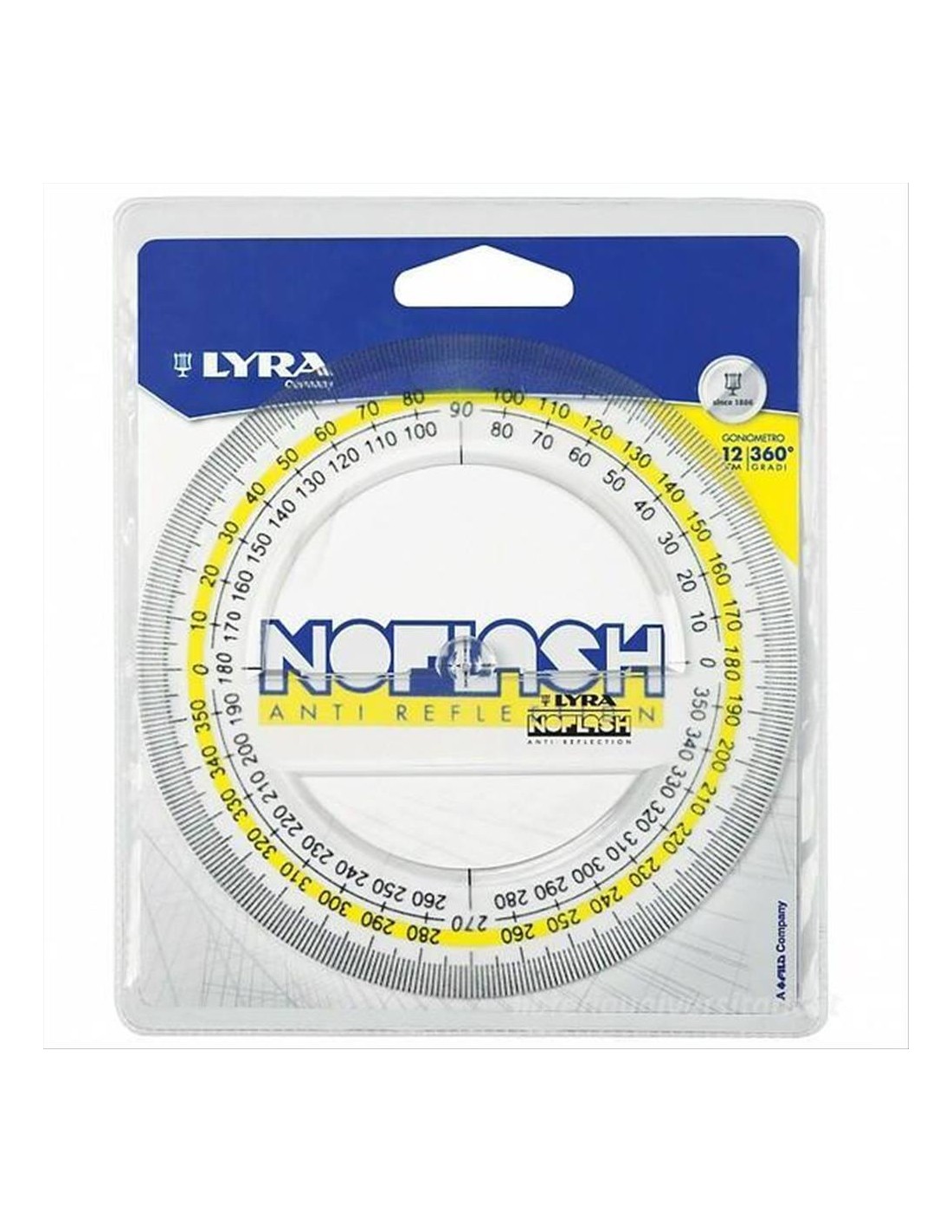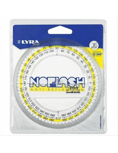 Goniometro circolare 360° da 12 cm Lyra Noflash, realizzato in materiale anti-riflesso per una lettura precisa e senza abbagli. Ideale per scuola, disegno tecnico e uso professionale.