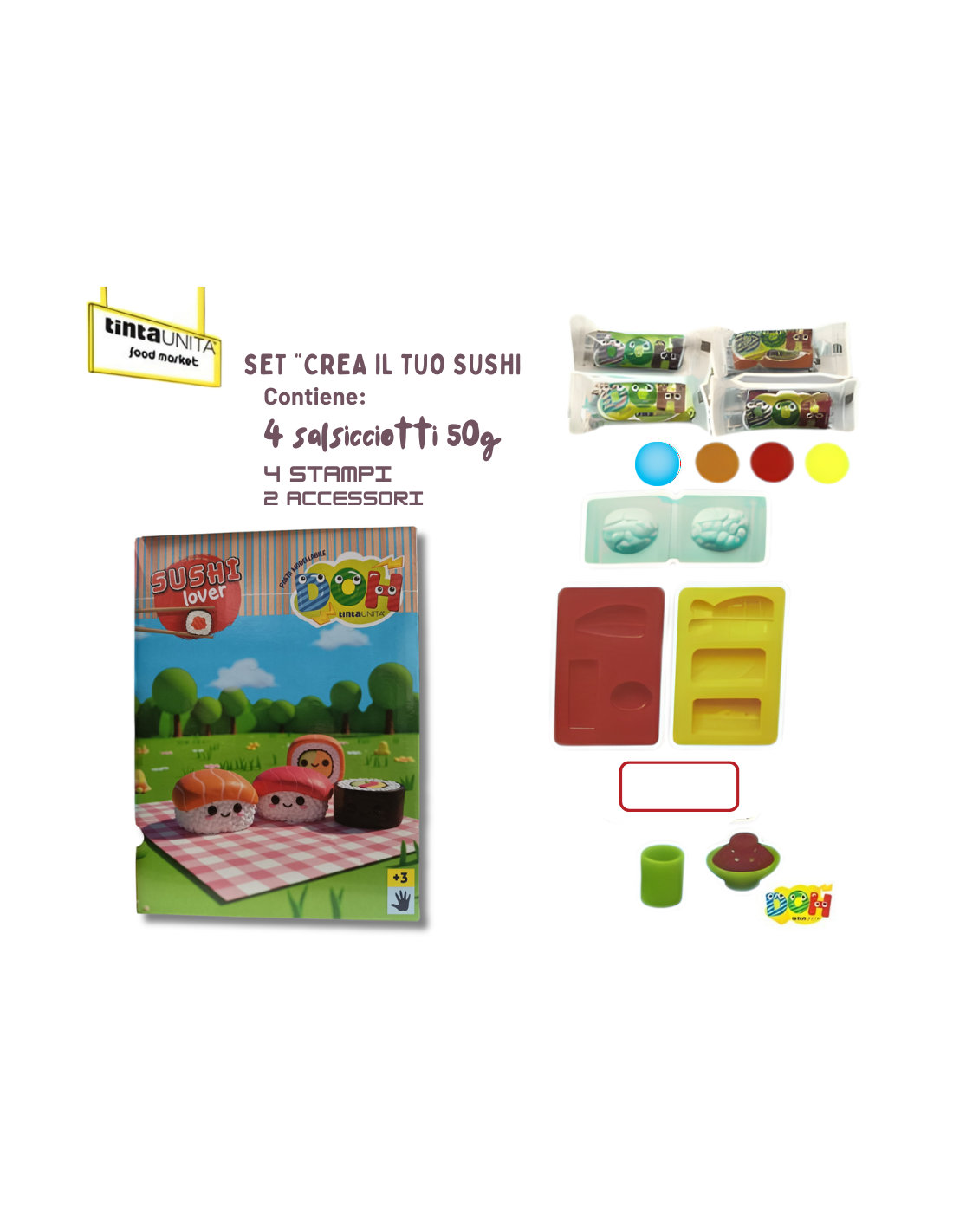 Tinta UnitaKit creativo Doh Tinta Unita Sushi con plastilina colorata e stampi per creare divertenti composizioni di sushi modellabile.