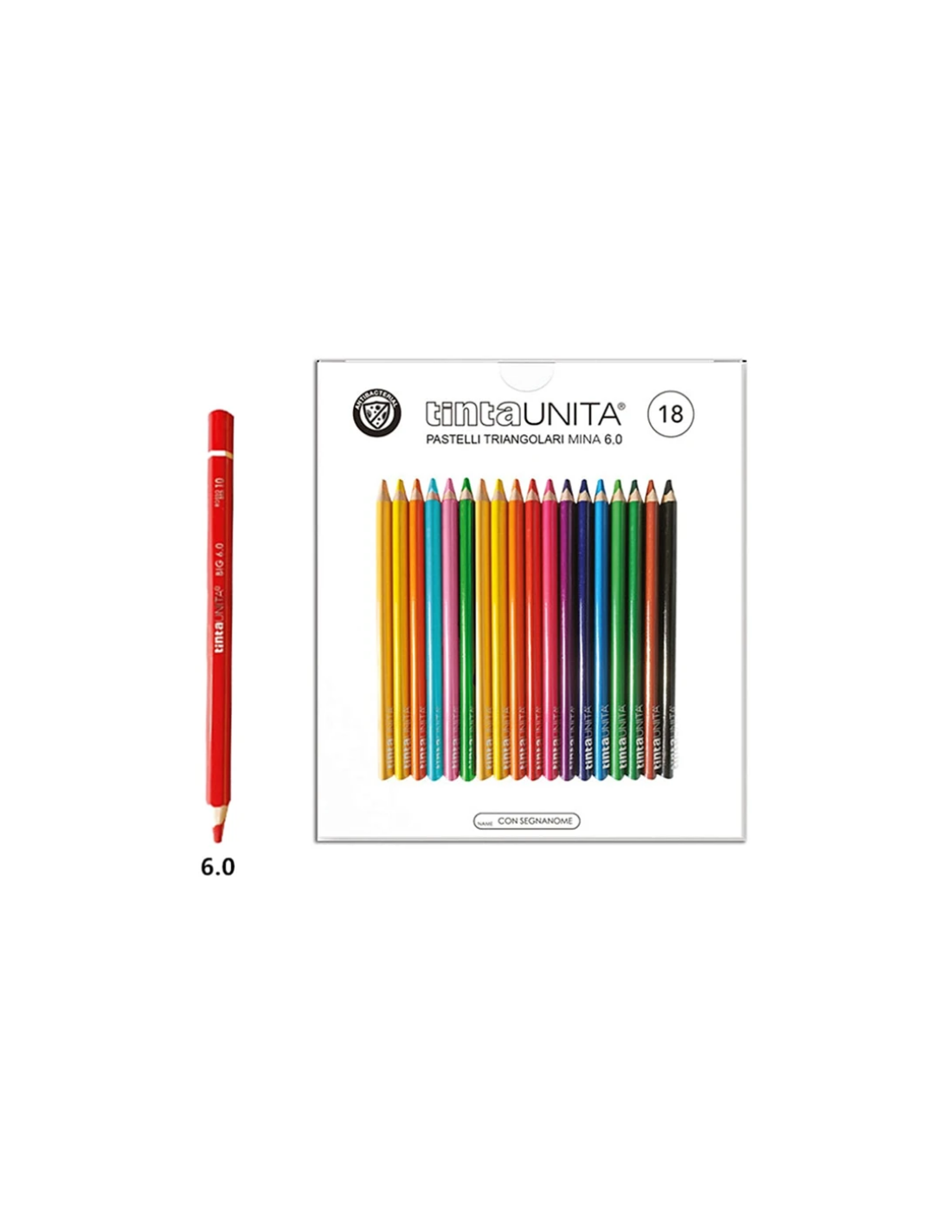 Confezione da 18 pastelli triangolari Big 6.0 Tinta Unita, con mina resistente e colori intensi. Ideali per scuola e attività creative.