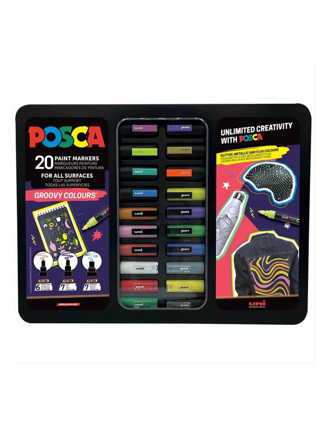 Valigetta in metallo Uni POSCA Groovy da 20 pennarelli assortiti, a base d’acqua, ideali per decorare e disegnare su molte superfici. Colori intensi, coprenti e sovrapponibili, pratici da trasportare e conservare.