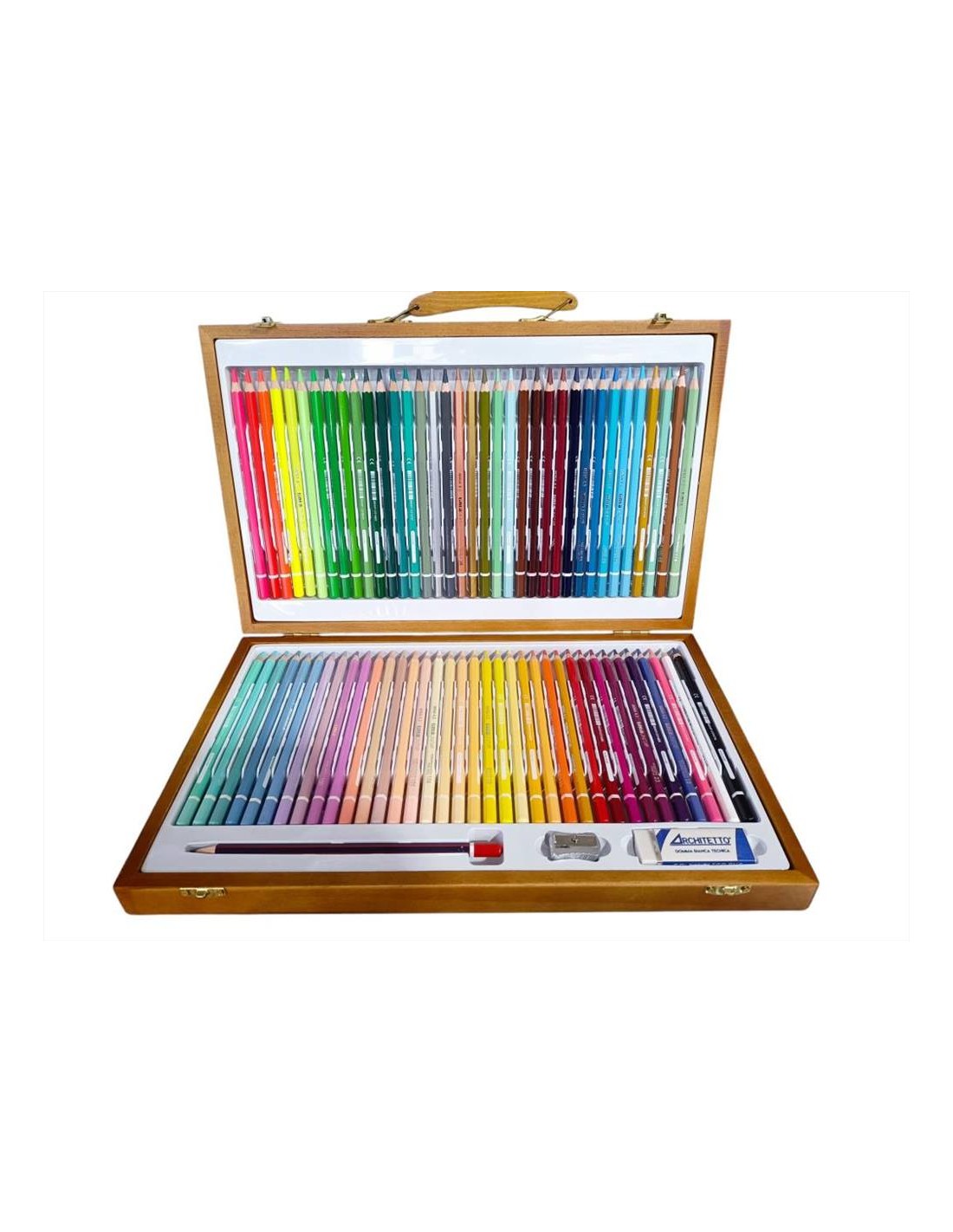La Valigetta in Legno Tinta Unita è il kit perfetto per artisti e creativi. Contiene 72 pastelli (36 classic, 36 pastel) a mina da 4.2 mm, una matita HB N.2, una gomma e un temperino Architetto.