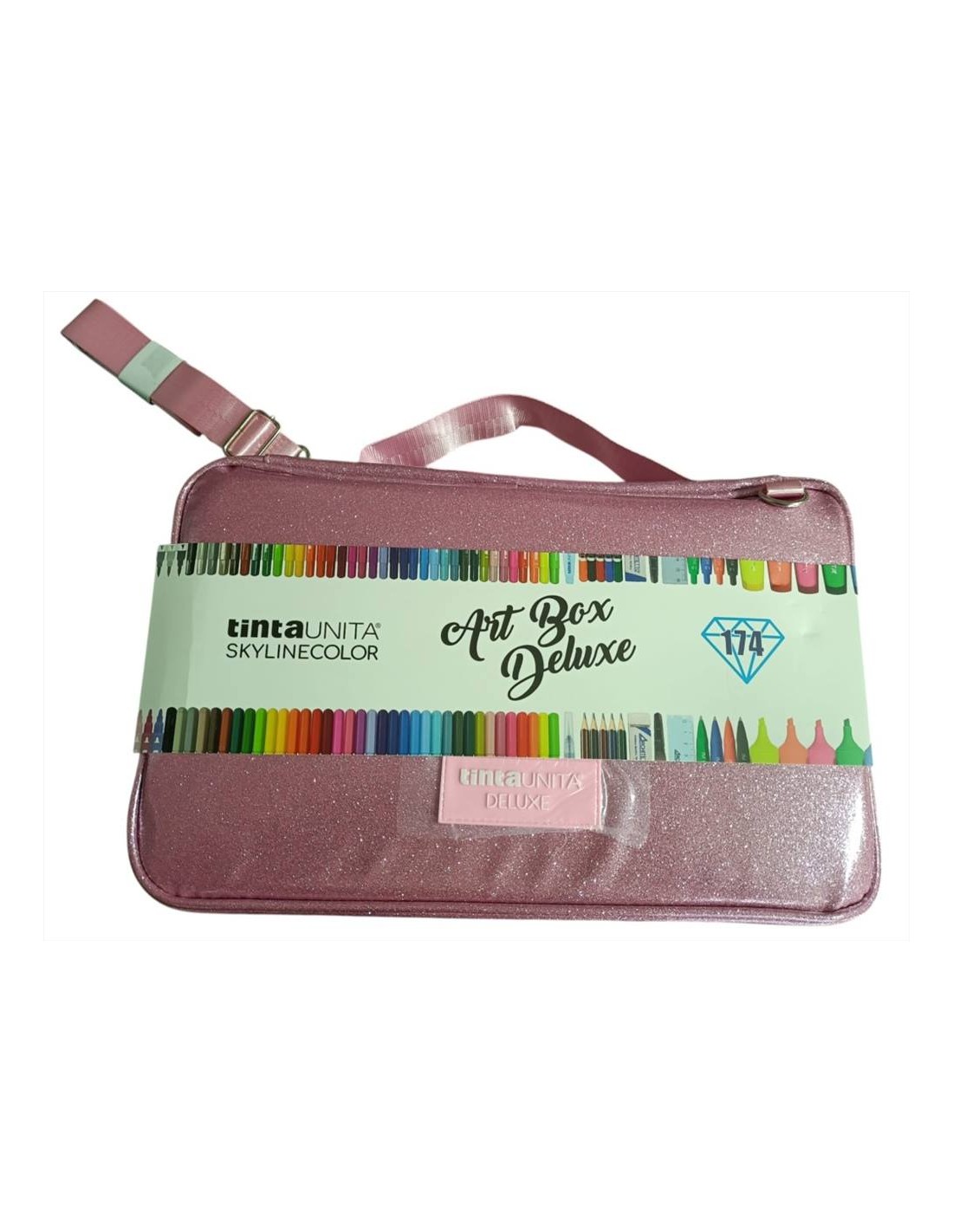 Astuccio Art Box One Time Premium Glitter da 174 pezzi, disponibile nei colori glitter rosa o azzurro. Realizzato in poliestere imbottito, include pastelli, pastelli acquerellabili, brush pen, pennarelli, evidenziatori e penne. Dotato di maniglia, tracolla removibile e tasca posteriore con zip. Dimensioni: 35×22×8 cm.
