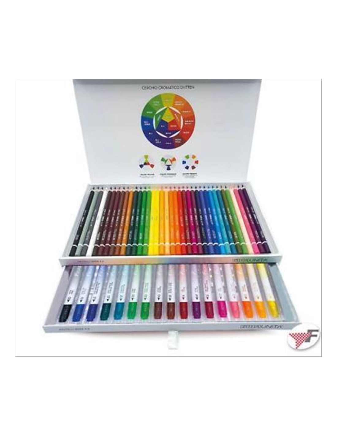Tinta Unita Art Box 2 piani: set creativo con 36 pastelli mina 4.0 e 18 brush bi-punta. Una combinazione perfetta per disegni precisi e sfumature vibranti, il tutto in un'elegante scatola magnetica.